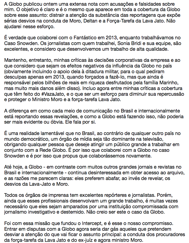 “Segue esclarecimento da Comunicação da Globo sobre a entrevista de Glenn Greenwald, publicada por seu veículo.