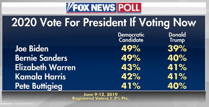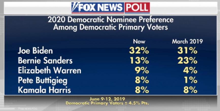 Essa pesquisa mostra vantagem firme de Joe Biden sobre Bernie Sanders. É preciso lembrar que a Fox é um veículo fortemente conservador. Os números mostram que Sanders perdeu intenções de voto para Joe Biden, que agora está quase 20 pontos à frente do candidato auto-intitulado socialista: a coluna da esquerda, “Now” (ou seja, hoje), mostra Biden com 32%, contra 13% de Bernie Sanders (que tinha 23% em março).