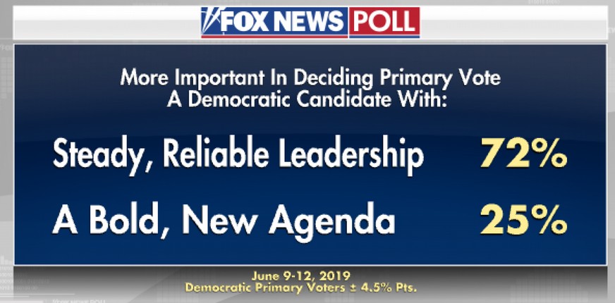 A pesquisa é se é mais importante, para o candidato do partido democrata, se ele é uma liderança firme e confiável, ou tem uma agenda nova e ousada: 72% ficaram com a primeira opção. Aparentemente, essa pergunta dá vantagem a Joe Biden, porque Bernie Sanders é mais conhecido justamente por sua ousadia e novidade.