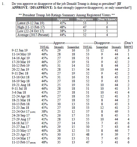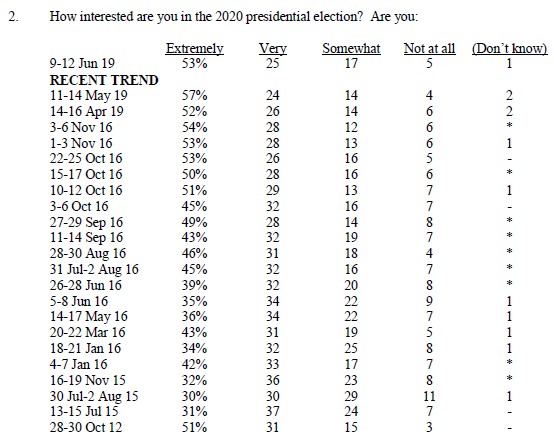 A Fox divulgou há pouco o resultado de uma pesquisa com várias perguntas relativas à próxima eleição presidencial dos EUA. A íntegra da pesquisa, com dados estratificados, pode ser baixada aqui. Reproduzimos alguns prints e tabelas estratificadas que achamos interessantes. A pesquisa foi feita entre os dias 9 e 12 de junho, com 1.001 eleitores. […]