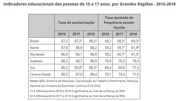 Se o acesso à escola tem melhorado, permanecem os problemas do atraso escolar e da evasão, mais característicos do ensino médio (15 a 17 anos), onde foi registrada, em 2018, taxa de frequência líquida de 69,3%, ou seja, 30,7% dos alunos estavam atrasados ou tinham deixado a escola. No Nordeste, a adequação idade/etapa ocorria para apenas 61,3% das pessoas de 15 a 17 anos, no Norte para 61,9%, enquanto no Sudeste para 76,4%. A taxa de frequência líquida nessa faixa era menor para pretos ou pardos (64,9%) do que para brancos (76,5%). Esse indicador era menor para homens (64,5%) do que mulheres (74,4%).