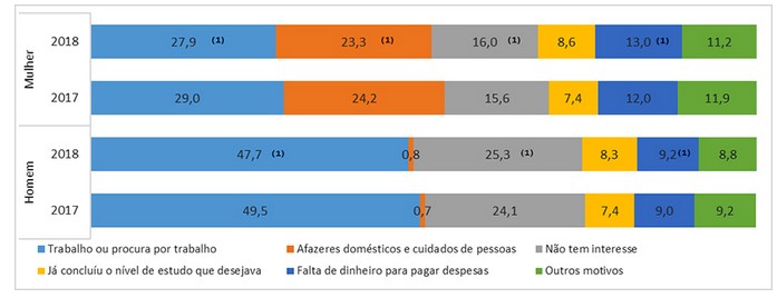 Cada grupo de jovens tem motivações diferentes para não seguir estudando ou ampliando a sua qualificação. Entre os homens, a principal motivação foi o trabalho ou a procura por trabalho (47,7%), já entre as mulheres, o trabalho foi importante (27,9%), mas a necessidade de realizar afazeres domésticos e cuidado de pessoas foi alegada como principal motivação por 23,3% delas. Apesar de alta, a motivação ligada ao mercado de trabalho caiu de 2017 para 2018 para ambos os sexos. Outra motivação que se destacou foi o não interesse em estudar ou se qualificar. Esta foi maior entre os homens, 25,3%, do que entre as mulheres, 16%, e aumentou nos dois grupos de 2017 para 2018. Já a falta de recursos para pagar as despesas ligadas a educação foi maior entre as mulheres (13%) do que entre os homens (9,2%) e, também, cresceu em 2018.