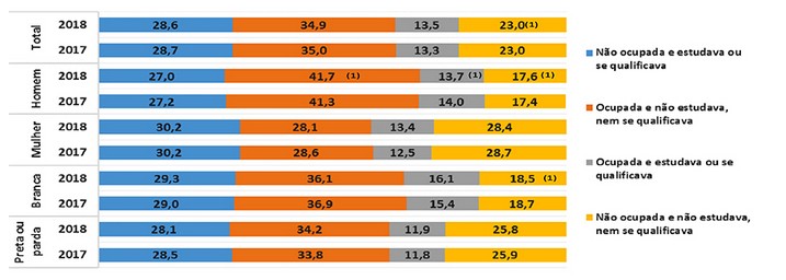 No Brasil, em 2018, havia 47,3 milhões de pessoas de 15 a 29 anos de idade. Dentre essas pessoas, 13,5% estavam ocupadas e estudando, 23,0% não estavam ocupadas nem estudando; 28,6% não estavam ocupadas, porém estudavam; e 34,9% estavam ocupadas e não estudando. Entre as mulheres, 28,4% não estavam ocupadas, nem estudando ou se qualificando, percentual estável frente a 2017. Entre os homens, 17,6% estavam nessa condição (0,2 p.p. a mais que em 2017). Por outro lado, 28,1% das mulheres e 41,7% dos homens apenas trabalhavam e 30,2% das mulheres e 27% dos homens apenas estudavam ou se qualificavam.