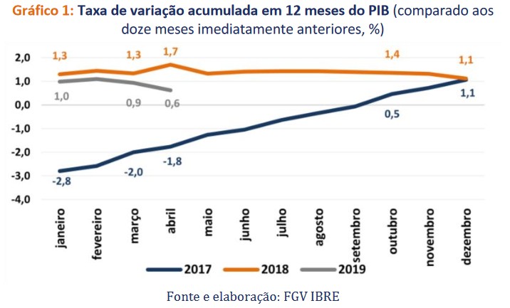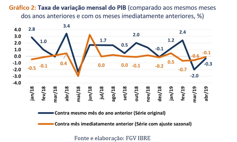 O Monitor do PIB-FGV aponta, nas séries dessazonalizadas, recuo de 0,1% do PIB em abril, na comparação com março; e, de 0,9% no trimestre móvel findo em abril (fev-mar-abril), em comparação ao trimestre findo em janeiro (nov-dez/18-jan/19). Na comparação interanual, a economia retraiu 0,3% em abril e permaneceu estagnada no trimestre móvel findo em abril.