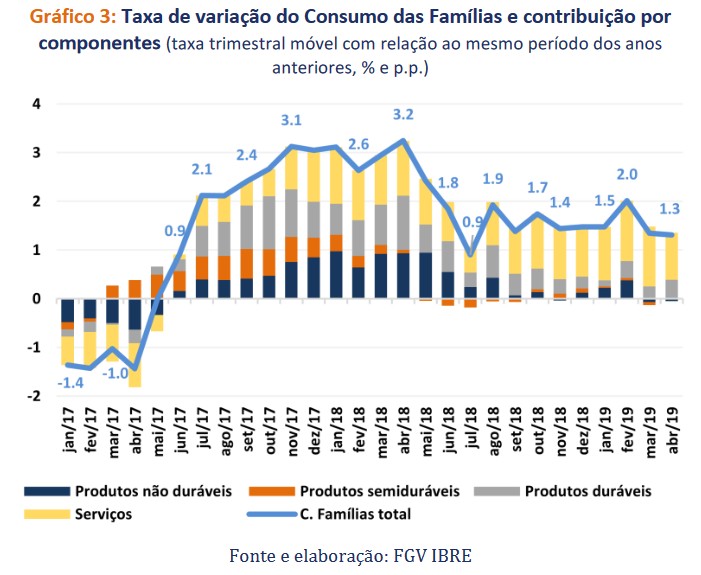 O consumo das famílias cresceu 1,3% no trimestre móvel findo em abril, em comparação ao mesmo trimestre de 2018. Conforme apresentado no Gráfico 3, o consumo de serviços continua sendo o que mais contribuiu para essa variação, tendo crescido 1,8% (com 1,1 p.p. de contribuição). O outro destaque é o consumo de produtos duráveis com crescimento de 4,5% (com 0,4 p.p. de contribuição) devido, principalmente, ao desempenho do consumo de veículos, motos, partes e peças. Na comparação realizada na série livre de efeitos sazonais, a taxa de variação mensal do consumo das famílias em abril, na comparação com março, foi positiva em 0,7%, com crescimento em todos os tipos de consumo.