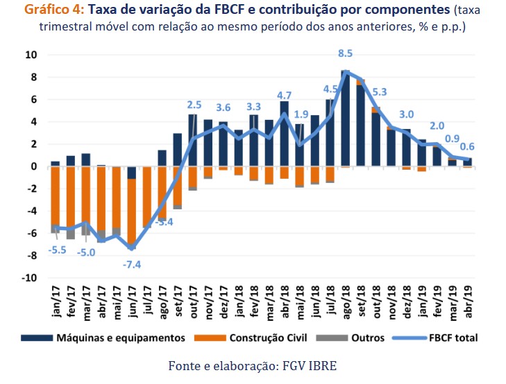 A FBCF, cresceu 0,6% no trimestre móvel findo em abril, em comparação ao mesmo trimestre de 2018. Mais uma vez, o desempenho positivo é devido ao componente de máquinas e equipamentos que apresentou crescimento de 1,9%, nesta comparação; este resultado foi influenciado, principalmente, por máquinas automotivas (automóveis e caminhões). Apesar de positivo, o resultado é declinante e está bem abaixo do ápice de 2018, registrado no trimestre findo em agosto (8,5%). Na comparação realizada na série livre de efeitos sazonais, a taxa de variação mensal da FBCF em abril, na comparação com março, foi positiva em 0,4% com crescimento de seus principais componentes: máquinas e equipamentos e construção.