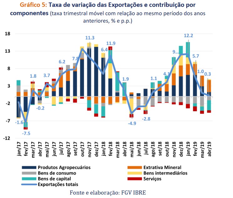A exportação apresentou crescimento de 0,3% no trimestre móvel findo em abril, em comparação ao mesmo trimestre de 2018. Este componente segue em desaceleração, desde seu ápice em janeiro; isto resulta, principalmente, da retração de bens de capital (-39,6%) e de bens de consumo duráveis (-31,1%). Os destaques positivos da exportação devem-se ao desempenho dos produtos da agropecuária (9,3%) e da extrativa mineral (22,8%).