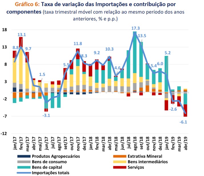 A importação apresentou retração de 6,1% no trimestre móvel findo em abril, comparativamente ao mesmo trimestre de 2018. As retrações da importação estão concentradas em bens de capital (-24,1%), bens de consumo duráveis (-19,7%), bens de consumo semiduráveis (-17,1%) e nos serviços (-12,8%). Os destaques positivos da importação devem-se ao desempenho dos produtos da agropecuária (11,5%) e da extrativa mineral (8,2%).