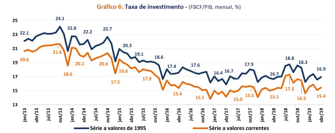 A taxa de investimento (FBCF/PIB) foi de 16,9%, em abril, na série a valores de 1995.