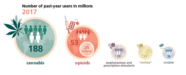 Em 2017, 271 milhões de pessoas com idade entre 15 e 64 anos – ou seja, 5,5% da população mundial nessa faixa etária – consumiram drogas. O número é parecido com o do ano anterior, mas é 30% maior se comparado aos dados de 2009.