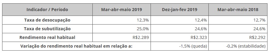 A taxa de desocupação foi estimada em 12,3% no trimestre móvel de março a maio de 2019, ficando estável em relação ao trimestre de dezembro de 2018 a fevereiro de 2019 (12,4%). Na comparação com o mesmo trimestre móvel de 2018, quando a taxa foi estimada em 12,7%, o quadro foi de queda (-0,5 ponto percentual).