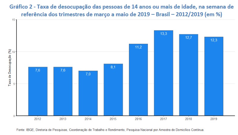 No trimestre encerrado em maio de 2019, a taxa de desocupação (12,3%) ficou estável em relação ao trimestre de dezembro de 2018 a fevereiro de 2019 (12,4%) e caiu na comparação com o mesmo trimestre de 2018 (12,7%).