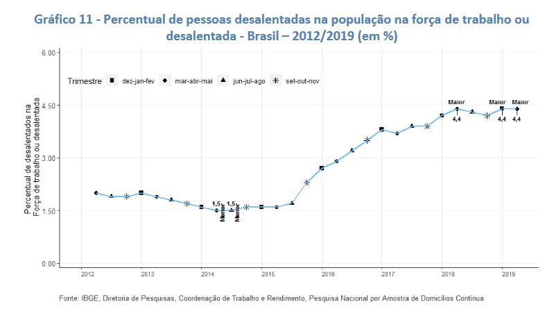 O contingente de pessoas desalentadas foi estimado 4,9 milhões no trimestre de março a maio de 2019, o recorde da série. Houve estabilidade em ambas as comparações. Já o percentual de pessoas desalentadas em relação à população na força de trabalho ou desalentada foi estimado em 4,4%, ficando estável em ambas as comparações.