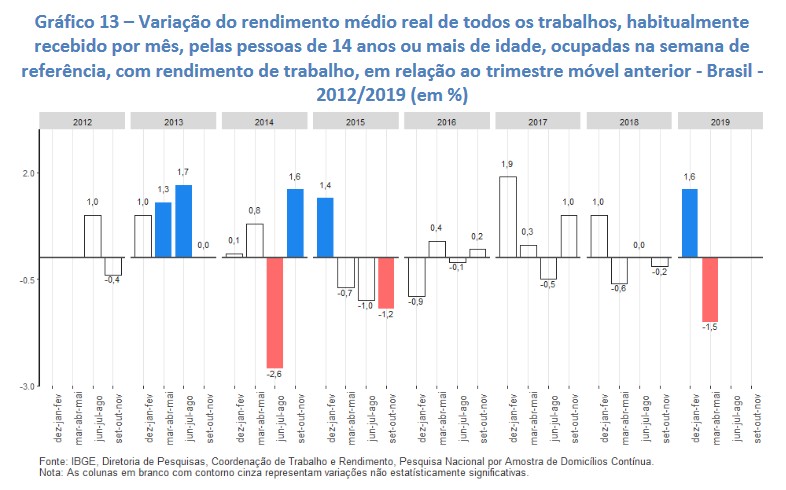 O rendimento médio real habitual (R$ 2.289) caiu 1,5% frente ao trimestre anterior e ficou estável frente ao mesmo trimestre de 2018. Já a massa de rendimento real habitual (R$ 207,5 bilhões) permaneceu estável em relação ao trimestre anterior e cresceu 2,4% (mais R$ 4,9 bilhões) frente ao mesmo período de 2018.