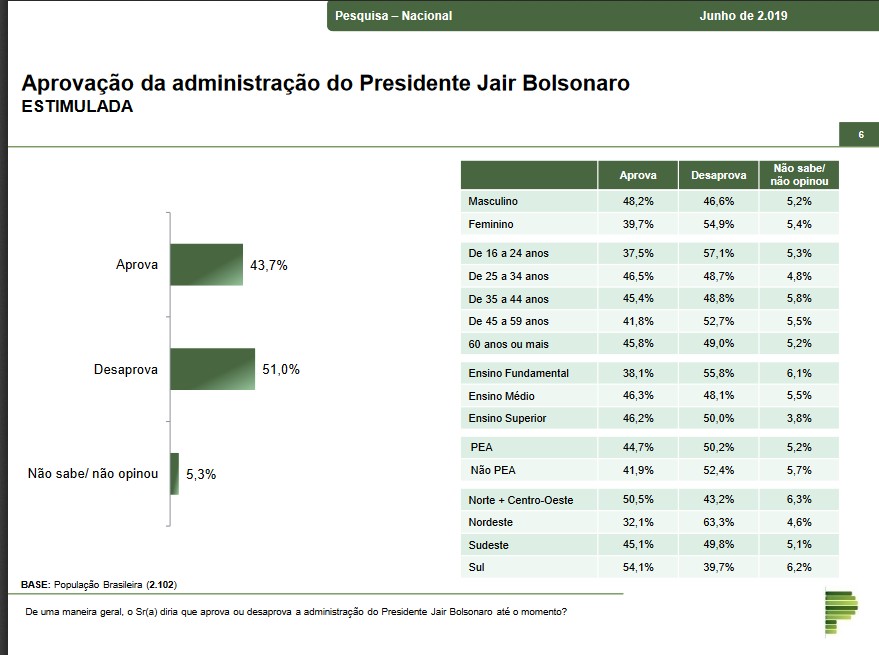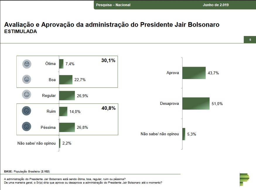 O instituto Paraná Pesquisas divulgou sondagem sobre o governo Bolsonaro, com trabalho de campo feito entre os dias 20 e 25 de junho, com mais de 2 mil pessoas.
