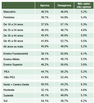 Entre pessoas com ensino médio, 46% aprovam e 48% desaprovam; entre aqueles com ensino superior, aprovação é de 46%, contra 50% que desaprovam.