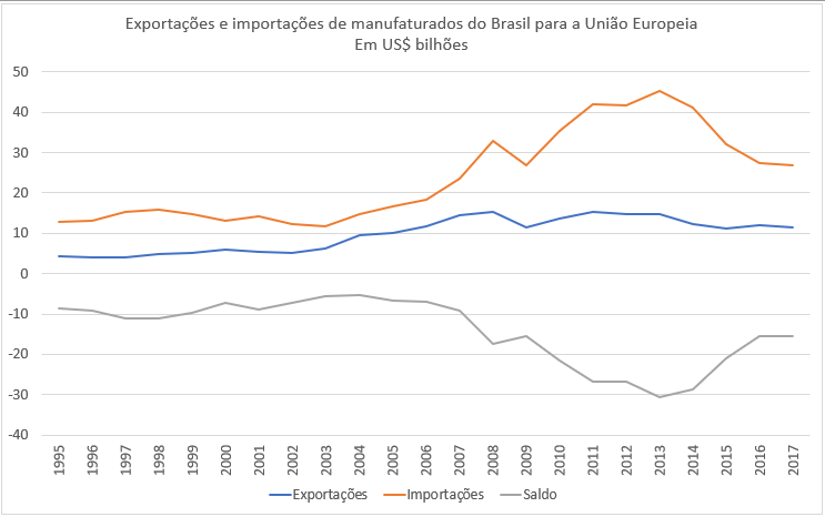 Os produtos primários corresponderam a 67% de nossa pauta de exportações para a União Europeia, em média, entre 2014 e 2017 (dados da Unctad, ainda não disponíveis para 2018). O restante é composto de manufaturados. Já estes últimos corresponderam a 86% de nossas importações, na mesma base de comparação. Assim, é muito claro que somos exportadores de primários e importadores de manufaturados para a União Europeia. Aliás, se compararmos apenas o valor das exportações de primários e importações de manufaturados para a UE desde 1995, só não há déficit nessa comparação entre 2003 e 2005, quando nossa taxa de câmbio era bastante competitiva. Esse resultado é mais que esperado, pois sabemos que exportar primários não gera valor suficiente para financiar a importação de manufaturados.