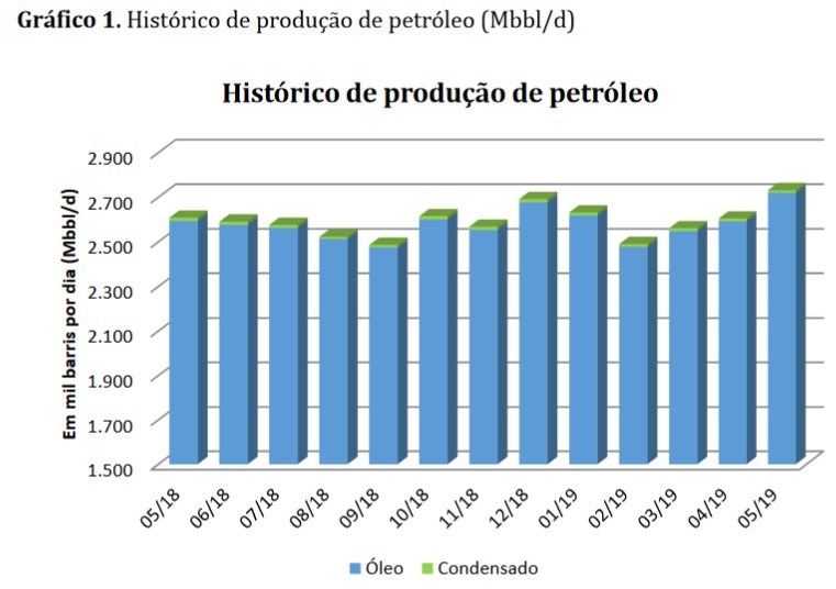 Já a produção de gás natural foi de 118 milhões de metros cúbicos por dia (m³/d), superando o recorde anterior de 117 MMm³/d registrados em outubro de 2018. Em relação ao mês anterior o crescimento foi de 4,4% e de 5,4% em relação a maio de 2018.