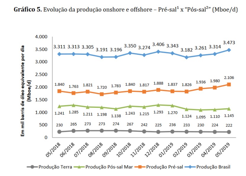 A produção do pré-sal também superou o recorde anterior tanto em volume quanto em percentual de participação no total nacional. Em maio, a produção, oriunda de 97 poços, foi de 2,106 milhões de barris de petróleo equivalente por dia (boe/d), sendo 1,674 milhão de barris diários (bbl/d) de petróleo e 68,7 milhões de metros cúbicos (m³/d), de gás natural.