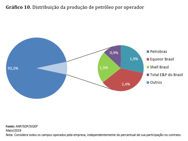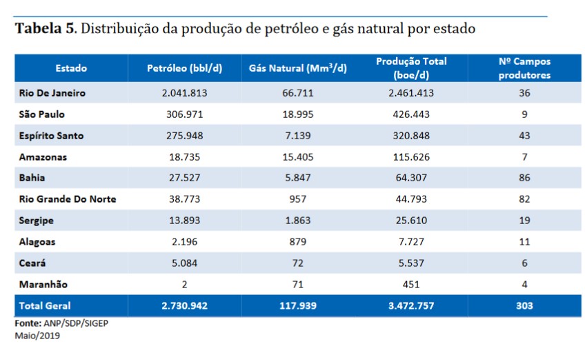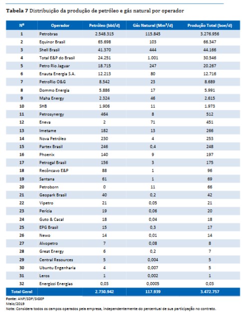 Em maio de 2019, 296 áreas concedidas, duas áreas de cessão onerosa e cinco de partilha, operadas por 32 empresas, foram responsáveis pela produção nacional. Destas, 71 são marítimas e 232 terrestres. Do total das áreas produtoras, 10 são relativas a contratos de áreas contendo Acumulações Marginais.