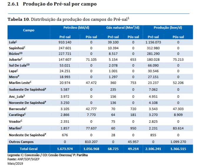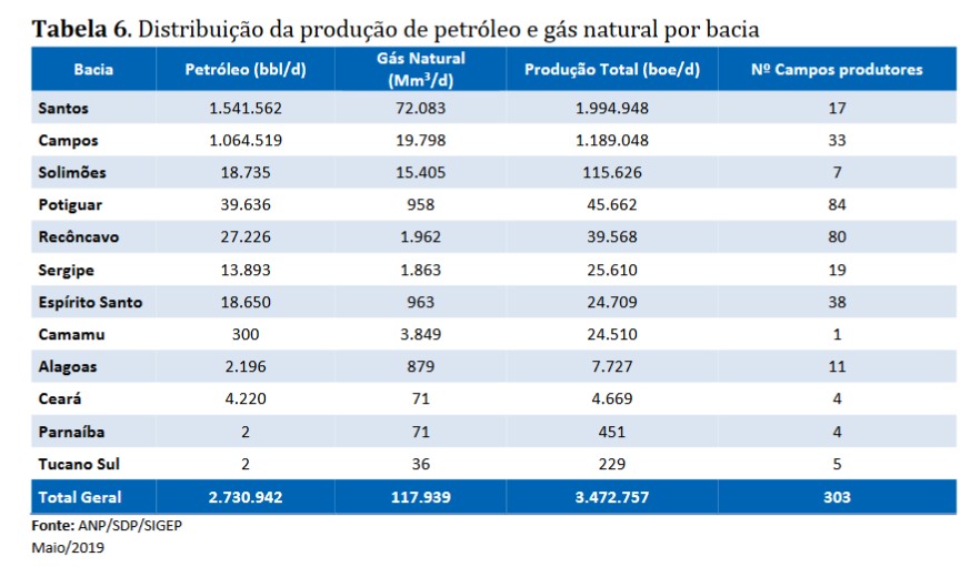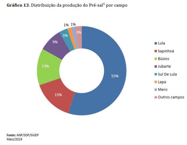 O campo de Lula, na Bacia de Santos, foi o que mais produziu petróleo e gás, com uma média de 910 mil de barris de petróleo por dia (bbl/d) e de 39,1 milhões de metros cúbicos de gás natural por dia (m³/dia).