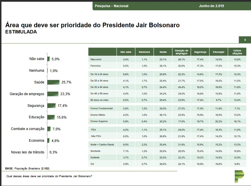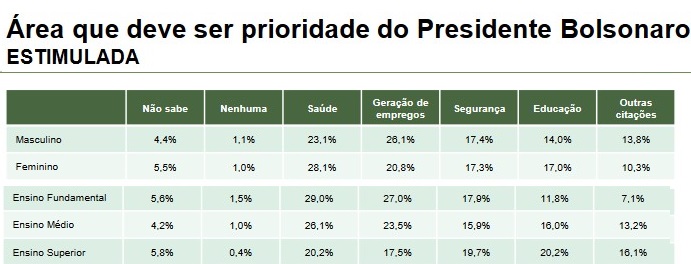 A pesquisa divulgada hoje por um instituto do Paraná revela que a maioria da população acha que as prioridades do governo Bolsonaro devem ser a saúde e o emprego.
