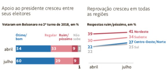 Entre os eleitores de Bolsonaro, a sua avaliação positiva cresceu expressivamente, de 54% para 60%, e a negativa ficou estável em 9%.