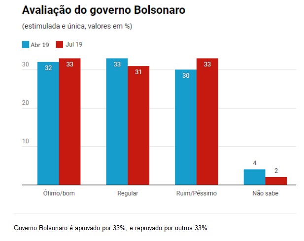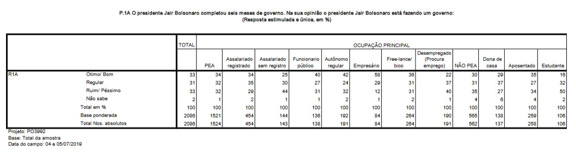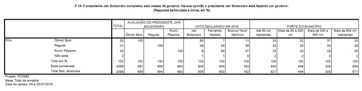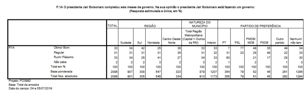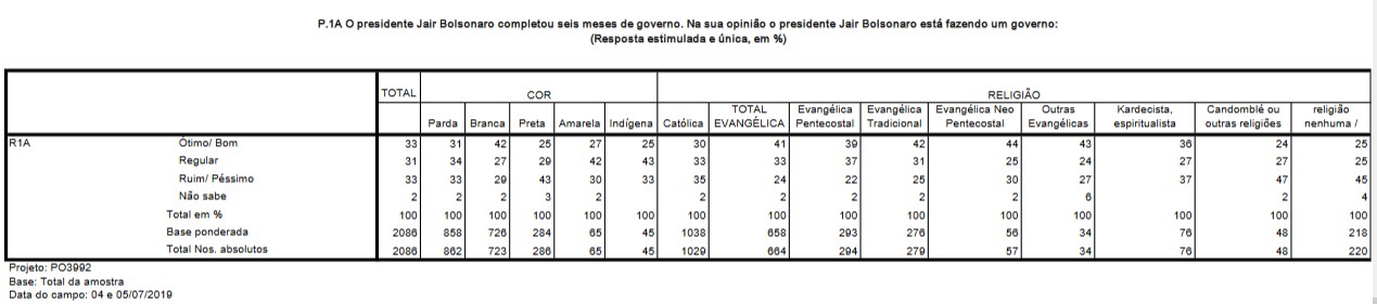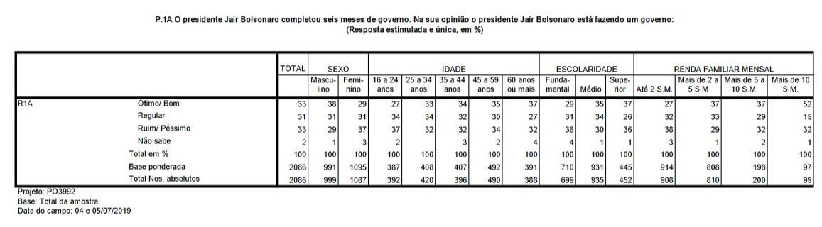 Seguem as tabelas com dados estratificados da avaliação de Bolsonaro, segundo o Datafolha. A pesquisa foi conduzida entre os dias 04 e 05 de julho de 2019.