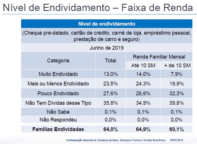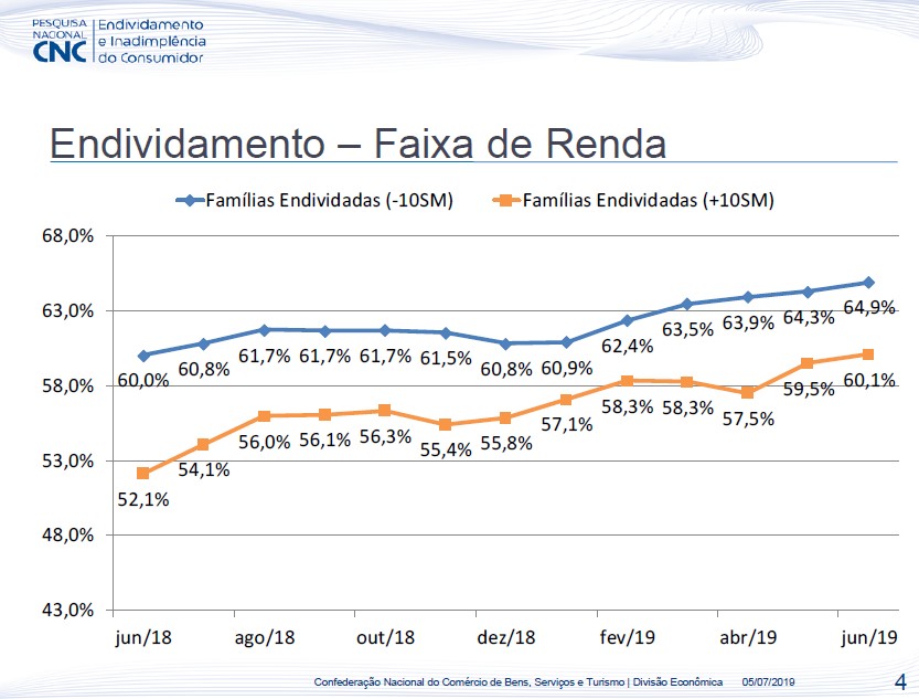 Em junho, a Pesquisa de Endividamento e Inadimplência do Consumidor (Peic), da Confederação Nacional do Comércio de Bens, Serviços e Turismo (CNC), mostra que aumentou pelo sexto mês consecutivo o percentual de famílias brasileiras endividadas, alcançando o maior patamar de endividamento desde julho de 2013. O endividamento cresceu 0,6 ponto percentual, em relação a maio, e na comparação anual – com junho de 2018 -, o aumento foi de 5,4 pontos percentuais. Apesar do aumento do endividamento das famílias, que chegou a 64,0%, a Peic identificou uma queda no número de famílias com dívidas ou contas em atraso, tanto na comparação mensal quanto na anual.