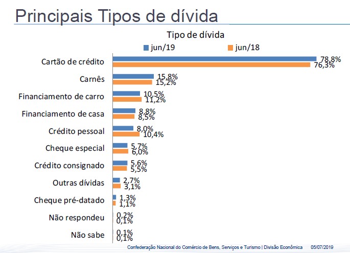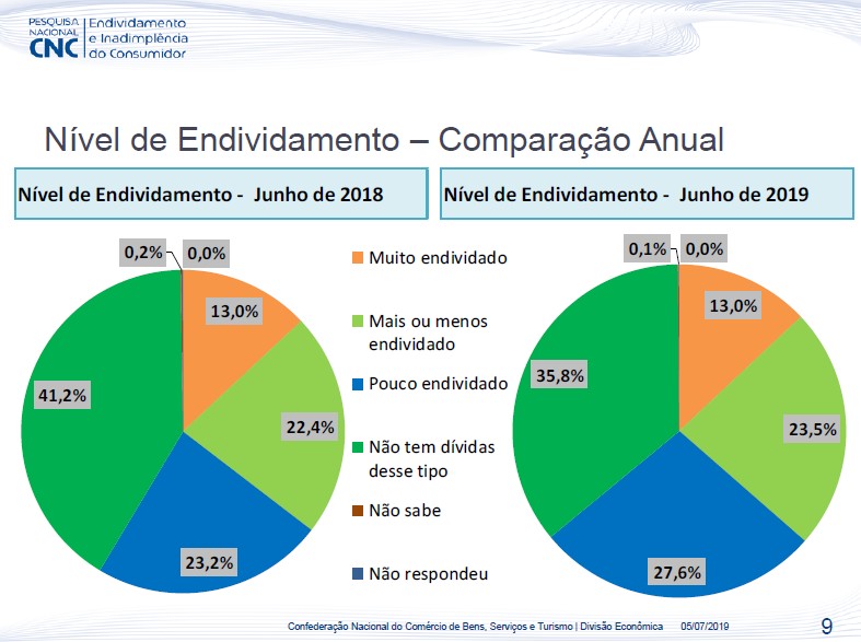 O cenário reflete as condições ainda favoráveis de juros e prazos, demonstrando uma melhora no perfil das dívidas. O índice das famílias que declararam que não teriam condições de pagar suas dívidas e permaneceriam inadimplentes ficou estável na comparação mensal, em 9,5%. Na comparação anual, as famílias se mostraram menos otimistas em relação à capacidade de pagamento, com crescimento de 0,1 p.p. em relação a junho de 2018 (9,4%).