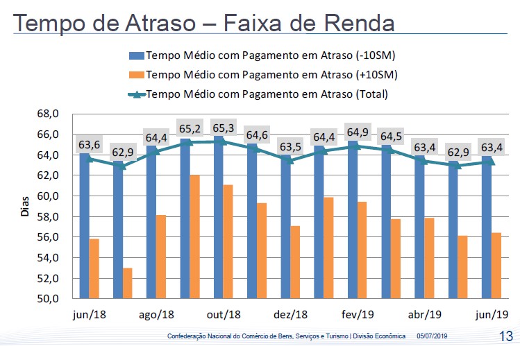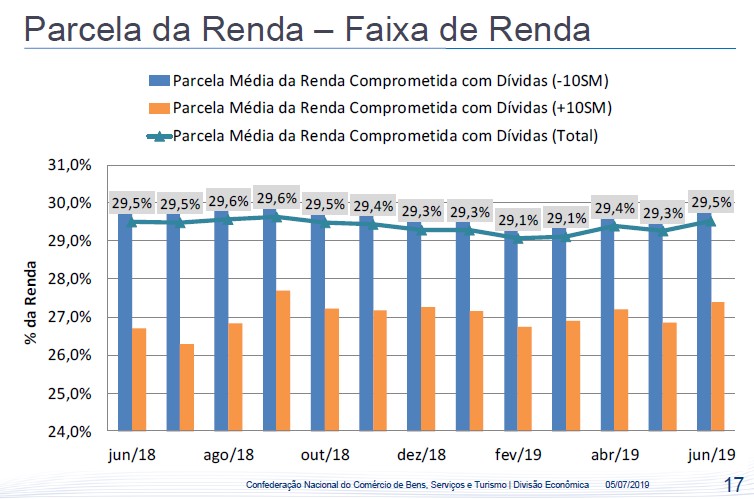 O tempo médio de comprometimento com dívidas entre as famílias endividadas foi de 7,0 meses, sendo que 24,7% delas estão comprometidas com dívidas até três meses; e 32,1%, por mais de um ano. Ainda entre as famílias endividadas, a parcela média da renda comprometida com dívidas ficou estável, na comparação anual, em 29,5% em junho de 2019, e 21,1% delas afirmaram ter mais da metade de sua renda mensal comprometida com pagamento de dívidas.