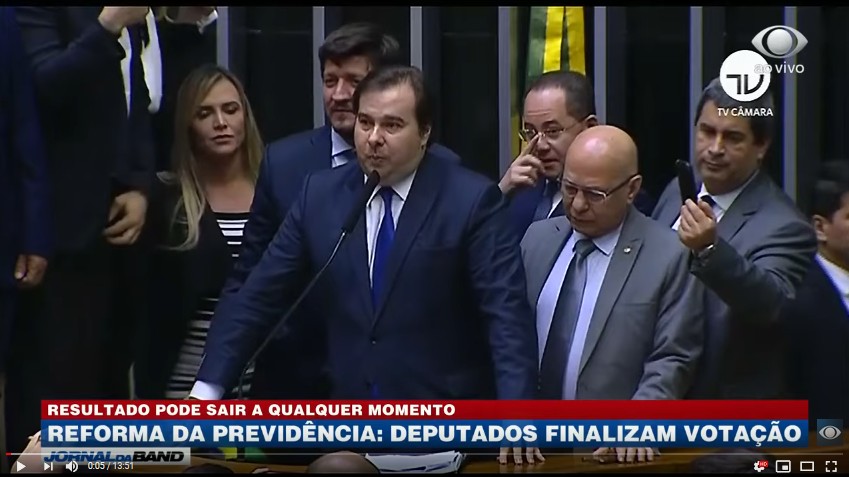 O presidente da Câmara, Rodrigo Maia, fez um discurso antes de anunciar o resultado da votação do texto-base da Reforma da Previdência no plenário.
