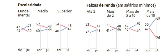 Entretanto, analisando os dados estratificados, notamos algumas tendências. Em alguns segmentos, como moradores da região sul, cidadãos com renda acima de 10 salários, residentes em municípios com mais de 200 mil habitantes, e pessoas com mais de 60 anos, a aprovação a Bolsonaro experimentou alta expressiva.