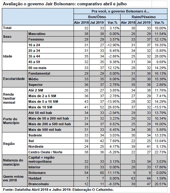 Os percentuais de bom/ótimo do governo oscilaram 1 ponto para cima, de 32% para 33% no intervalo entre abril e julho, revelando que houve um processo de estabilização da aprovação a Bolsonaro, após o “choque” dos três meses iniciais, quando a opinião pública pode entender melhor como é, e quem é, o novo presidente.