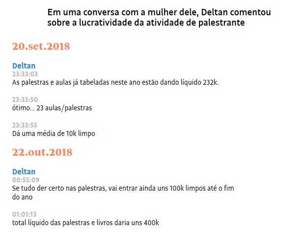 Deltan faturava alto com a fama de justiceiro. Em mensagem para sua esposa, ele informa que “total líquido de palestras e livros daria 400 k”, ou seja, R$ 400 mil, em apenas um ano.