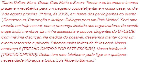 A revelação foi feita hoje pelo blog do Reinaldo Azevedo. O blogueiro (sem aspas) pegou leve. Disse que não era denúncia. O ministro do STF, Roberto Barroso, chamou Sergio Moro e Deltan Dallagnol para um jantar íntimo em sua casa.