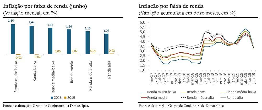Embora pelo 3º mês consecutivo tenha ocorrido desaceleração no ritmo de crescimento dos preços para todas as classes, as famílias mais ricas ainda registraram variação positiva de preços (0,03%). A deflação dos alimentos impactou menos os segmentos de renda mais alta, devido ao peso relativamente menor desse grupo na cesta de consumo dessas famílias. Por outro lado, a queda nos preços dos combustíveis gerou um alívio inflacionário muito maior nas faixas de renda mais alta e compensou o aumento de 18,9% nas passagens aéreas.