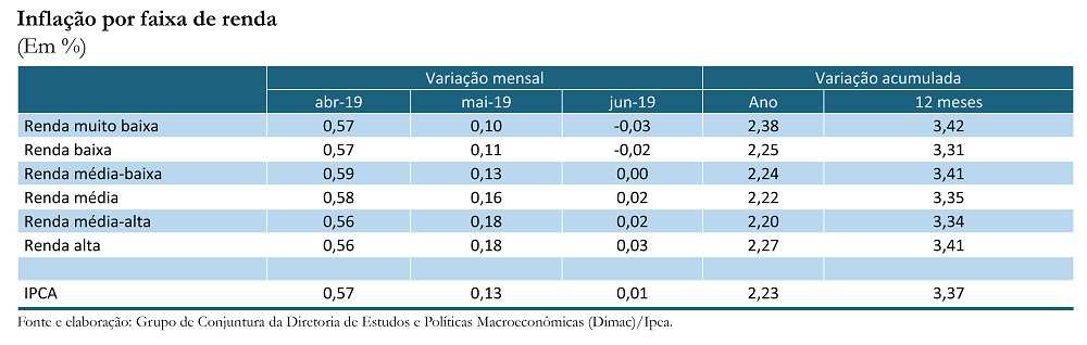 Divulgado nesta sexta-feira, 12, o Indicador Ipea de Inflação por Faixa de Renda aponta em junho a primeira deflação desde novembro de 2018 para as classes de renda mais baixa (-0,03), devido principalmente à queda de preços de alimentos e bebidas. Ficaram mais baratos itens importantes como cereais (-4,5%), frutas (-6,1%) e massas e farinhas (-0,75%).