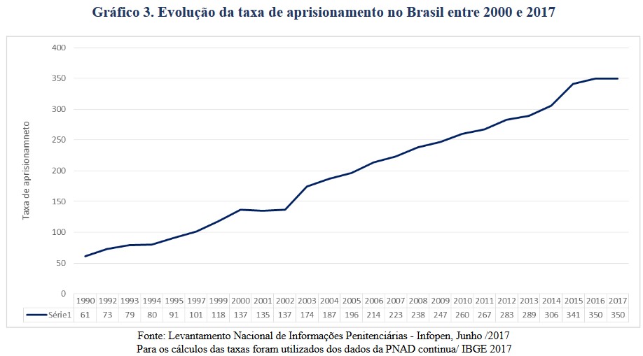 A taxa de encarceramento se multiplicou por sete vezes nos últimos 30 anos: estava perto de 50 pessoas presos para cada 100 mil habitantes, no início dos anos 90, e hoje está em 350 pessoas presas por 100 mil habitantes.