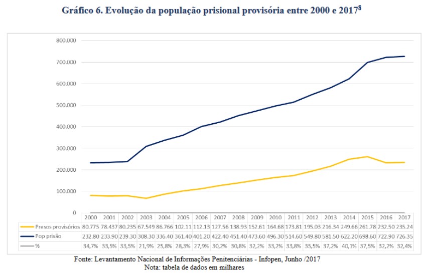 Houve uma leve melhora, nos últimos dois anos, do percentual de presos provisórios (presos sem condenação) no país: após chegar a 40% em 2014, declinou para 32% em 2017. O aumento de presos provisórios experimentou, a partir de 2012 e 2013, um crescimento muito acelerado, que vai até 2015, e cai em 2016 e 2017.