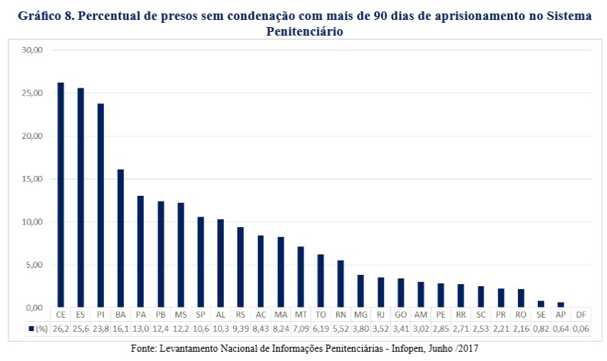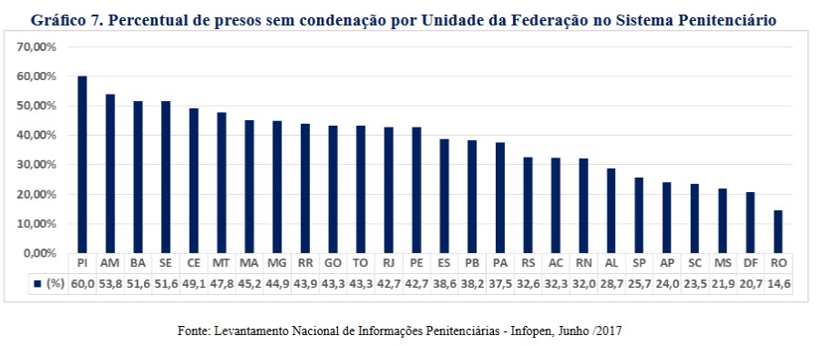 Alguns estados do Norte e Nordeste tem níveis extremamente altos de presos provisórios, como Piauí, onde estes chegam a 60% da população carcerária. Em Amazonas, Bahia, Sergipe e Ceará, estes são um pouco mais ou menos de 50%.