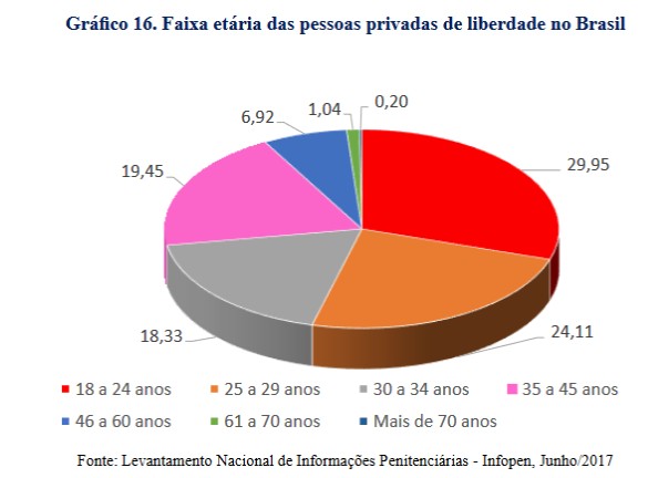 Na  análise por idade, constata-se que a população carcerária é bem jovem.  Segundo o Infopen, 30% dos presos tem entre 18 e 24 anos. Segundo o TSE, o eleitorado com 18 a 24 anos representa 14% do total.