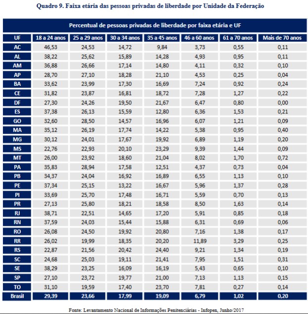 Alguns estados são particularmente duros com os jovens, como o Acre e Alegas, onde 46% e 38%, respectivamente, da população carcerária tem entre 18 e 24 anos.