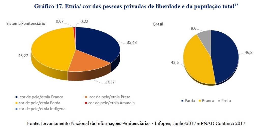Na divisão por cor, ou etnia, temos uma população carcerária mais negra do que a média nacional. Segundo o Infopen, 17% dos presos são negros e 46% são pardos, contra uma média nacional de 8,6% de negros e 46% de pardos. Ou seja, a população parda é igual o percentual de negros presos é o dobro da média nacional.