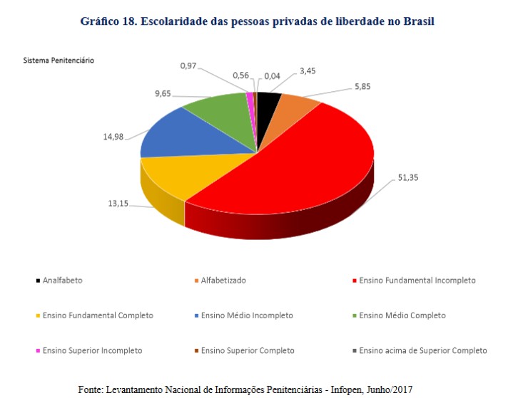 A maioria dos presos no Brasil tem pouquíssima escolaridade: 51% tem fundamental incompleto e 3,45% são analfabetos; 13% tem o fundamental completo e 9%, o ensino médio completo.