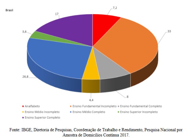 Para comparar com a população brasileira: o percentual de brasileiros adultos com ensino fundamental incompleto ou analfabetos é de 33% e 7%, respectivamente; 27% tem ensino médio completo.