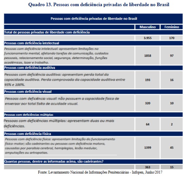 O Brasil tem quase 4 mil presos com algum tipo de deficiência: sendo 1.858 com deficiência mental, 193 surdos, 320 cegos, 64 com deficiências múltiplas, e 1.400 com deficiência físico-motora; há ainda 363 cadeirantes no sistema.