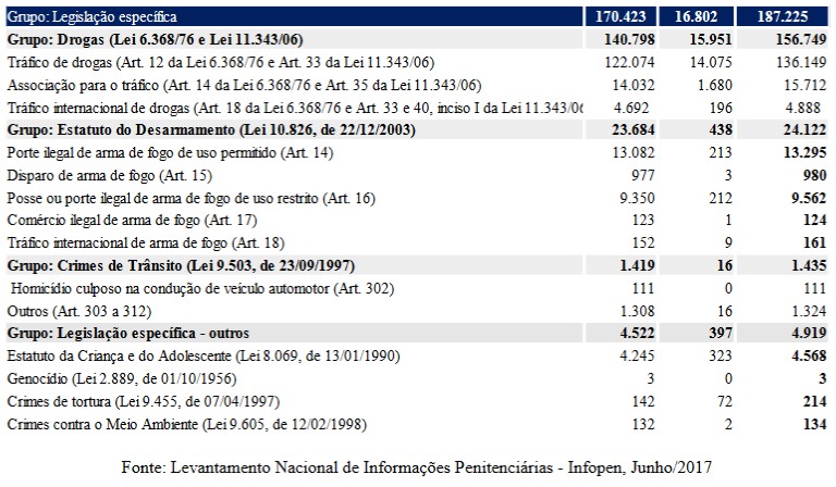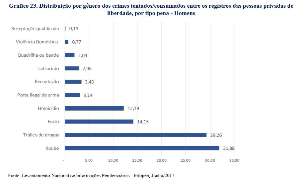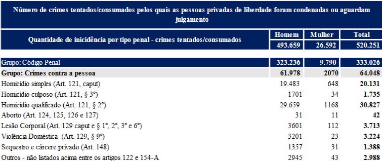 Do total da população carcerária já condenada, que é de 520,2 mil, temos 64 mil presos por crimes contra a pessoa, 235 mil presos por crime contra o patrimônio,  e 157 mil pessoas presas por crimes relacionadas às drogas.