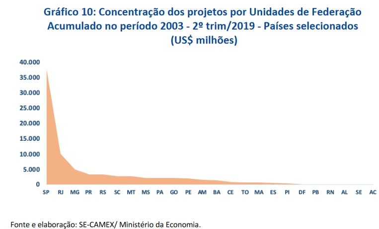 No segundo trimestre de 2019 foram identificados 36 projetos de investimento estrangeiro direto (IED) no Brasil, provenientes de 22 empresas de cinco países: Estados Unidos (EUA), China, Japão, França e Itália.
