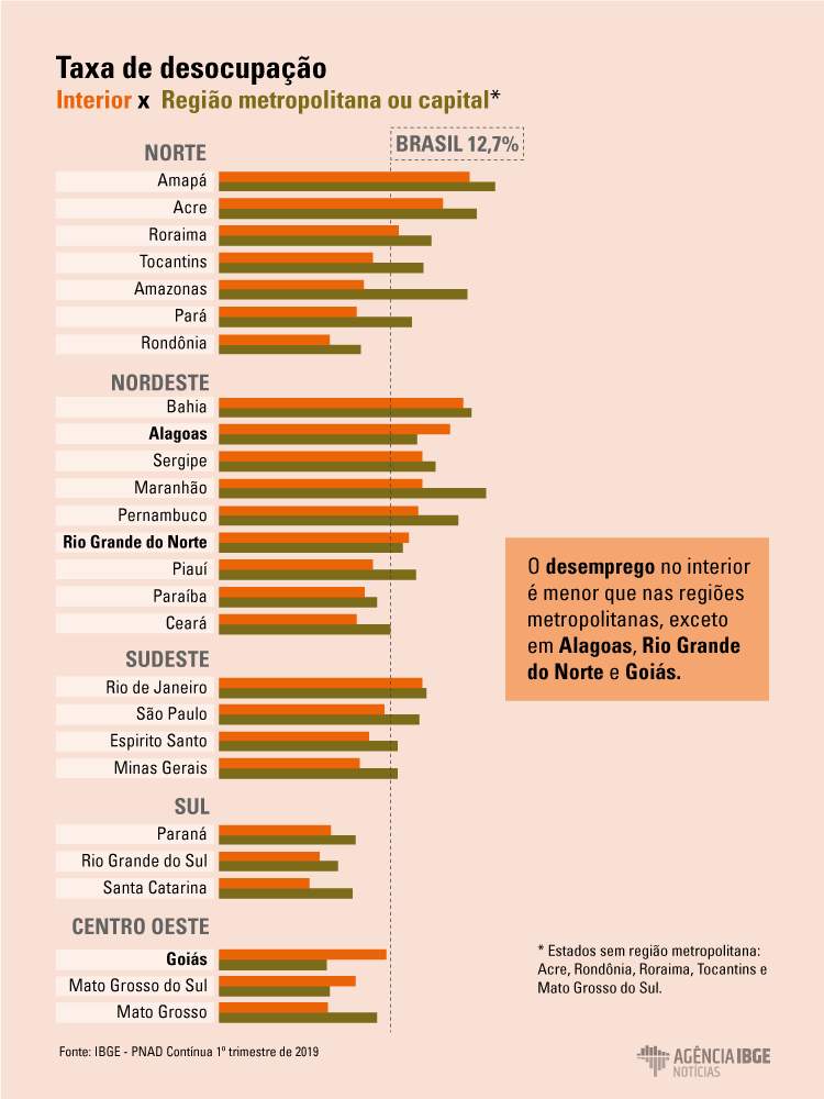 Um levantamento feito a partir dos microdados da Pesquisa Nacional por Amostra de Domicílios Contínua (PNAD Contínua) revelou um retrato inédito do mercado de trabalho do interior do país. As informações do primeiro trimestre de 2019 mostram que o desemprego no interior é menor que nas regiões metropolitanas em 18 estados. Entre os cinco estados sem região metropolitana, apenas o interior do Mato Grosso do Sul tem a desocupação maior que a capital.